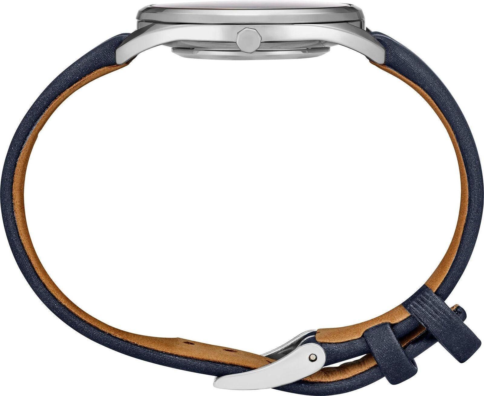 Seiko essentials quartz womens watch SWR079. Stainless steel case with blue satin finish faux leather strap. White mother-of-pearl dial, textured markers. Quartz movement. Hardlex crystal. Pin buckle clasp. Round case shape. Case size 32mm. Water resistance up to 50 meters.
