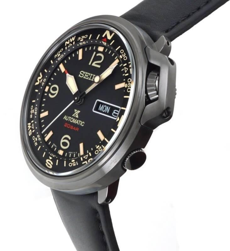 Seiko prospex automatic men's watch SRPD35K1. Stainless steel black plated (hard coating) case with a black calfskin band, black dial. Automatic movement with manual winding. Curved Hardlex, lumibrite on hands and indexes. Water resistance upto 200m / 20 bar. Case thickness 14.4 mm, case diameter 43 mm, case length 43 mm. Rotating compass inner ring. Screw case back. See-through case back. Other Features: 24 jewels, day/Date display, stop second hand function.