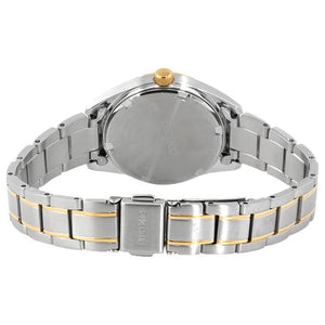 Seiko quartz womens watch SUR466. Two-tone stainless steel case and bracelet, white dial. Case size 29.8 mm. Water resistant up to 100 meters. Quartz movement. Sapphire crystal. Three-fold clasp with push button release.