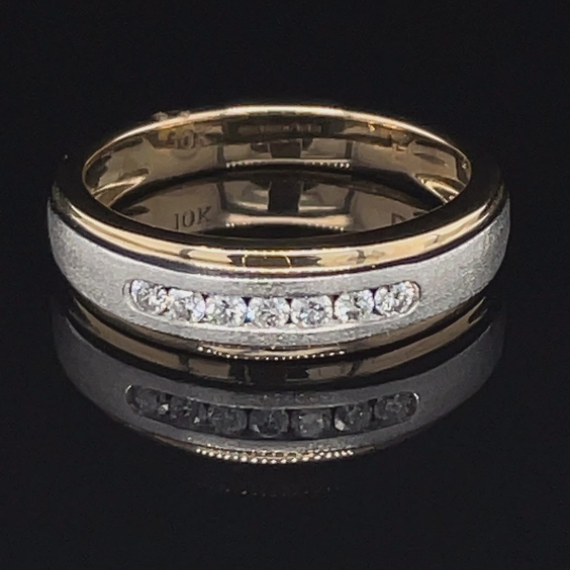 The classic elegance of this diamond anniversary band will make a rich style statement for anyone in solid 10k gold. Meticulously handcrafted to perfection this ring has center-hosted 7 sparkling round big diamonds to enhane the brilliance. A total of 0.15 carat of diamonds are set in 10K yellow and white gold with high polish edges and sand blast finish.