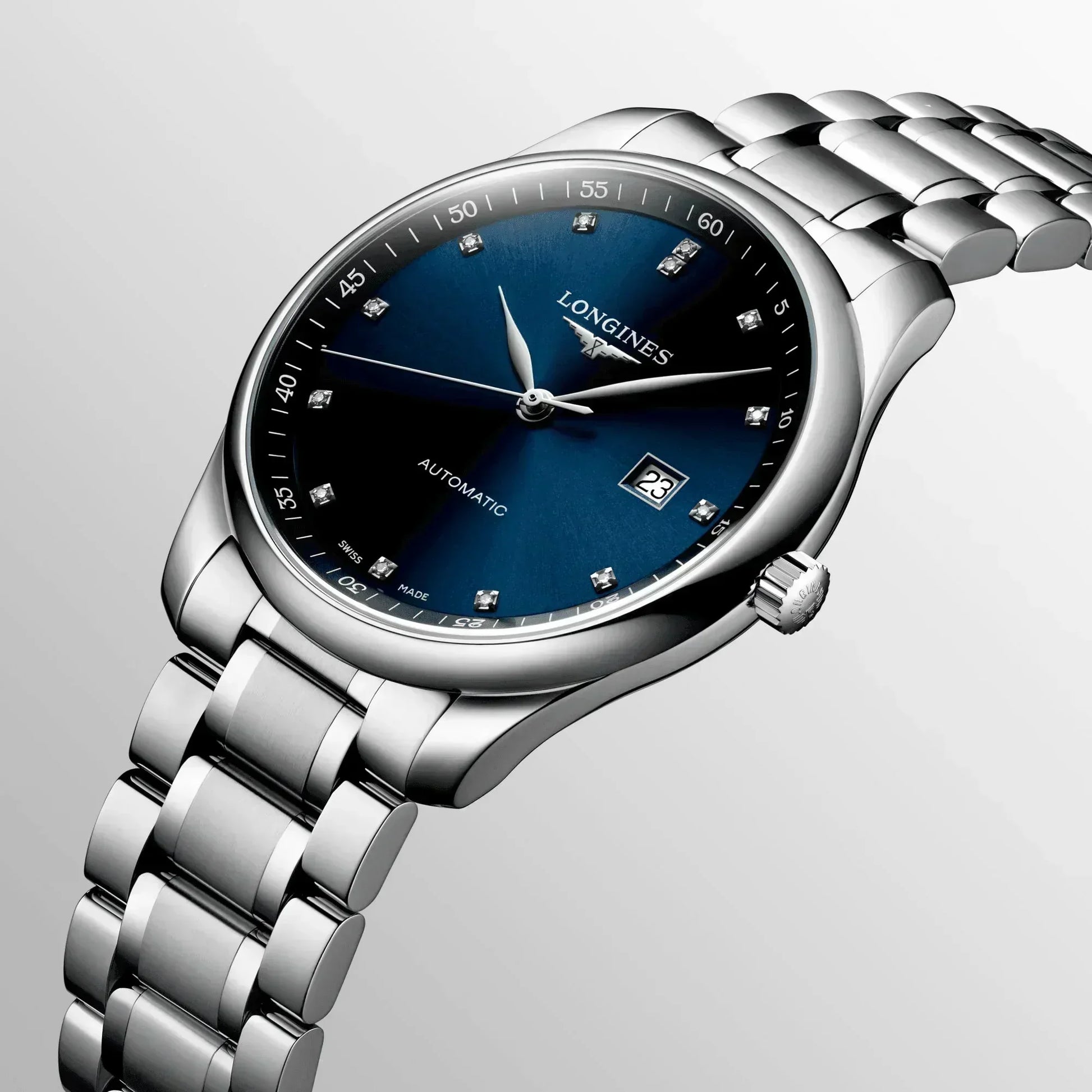 Long experience meets vast expertise. As a traditional watchmaking company, Longines has been producing exceptional timepieces since the very beginning. Today, the Longines Master Collection is the perfect illustration of this corporate ethos, as can be seen from the success enjoyed by this range since it was launched in 2005. All fitted with self-winding movements, the various models in this collection offer many special features. The Longines Master Collection brings together the classical elegance and excellent quality which never cease to delight those who appreciate exceptional timepieces. Stainless steel with Sunray blue dial. Dial set with 13 Top Wesselton VS-SI diamonds, for a total of 0.059 carats. Round case shape. Scratch-resistant sapphire crystal. Stainless steel with triple safety folding clasp and push-piece opening mechanism. Automatic self-winding mechanical movement beating at 25'200 vibrations per hour, with a power reserve of approximately 72 hours. Functions: Hours, minutes, seconds and date. Water resistance up to 30 meters.