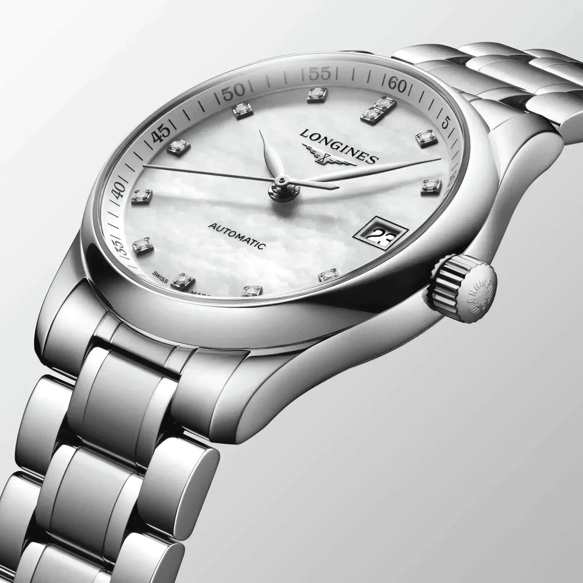 Long experience meets vast expertise. As a traditional watchmaking company, Longines has been producing exceptional timepieces since the very beginning. Today, the Longines Master Collection is the perfect illustration of this corporate ethos, as can be seen from the success enjoyed by this range since it was launched in 2005. All fitted with self-winding movements, the various models in this collection offer many special features. The Longines Master Collection brings together the classical elegance and excellent quality which never cease to delight those who appreciate exceptional timepieces. Stainless steel with White mother-of-pearl dial. Dial set with 12 Top Wesselton VS-SI diamonds, for a total of 0.055 carats. Round case shape. Scratch-resistant sapphire crystal, with several layers of anti-reflective coating on the both side. Stainless steel with triple safety folding clasp and push-piece opening mechanism. Automatic self-winding mechanical movement beating at 25'200 vibrations per hour, with a power reserve of approximately 72 hours. Functions: Hours, minutes, seconds, date. Water resistance up to 30 meters.