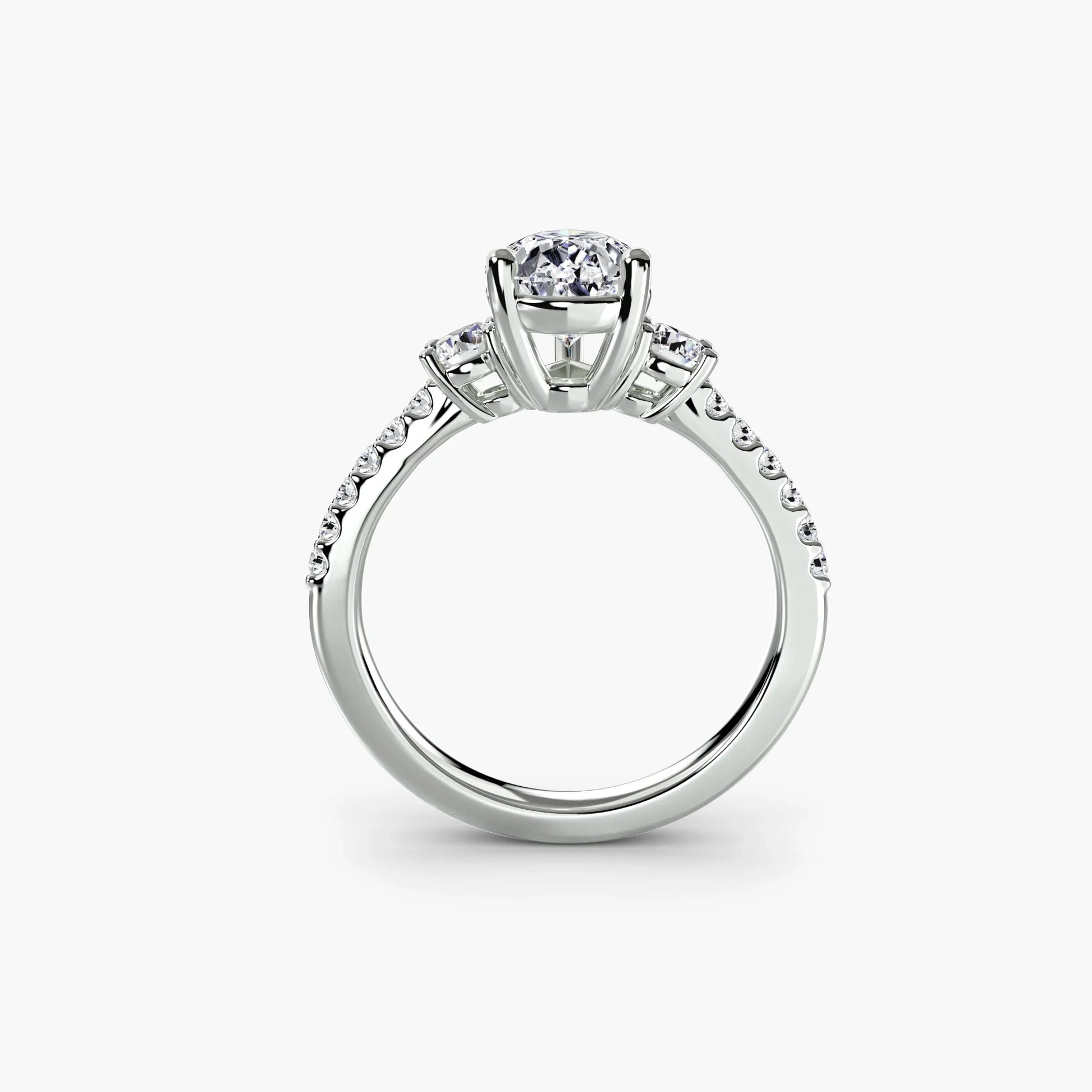 This elegant three-stone ring symbolizes your past, present, and future, elevated with a pavé band for extra sparkle and detail. A perfect union of meaning and brilliance.