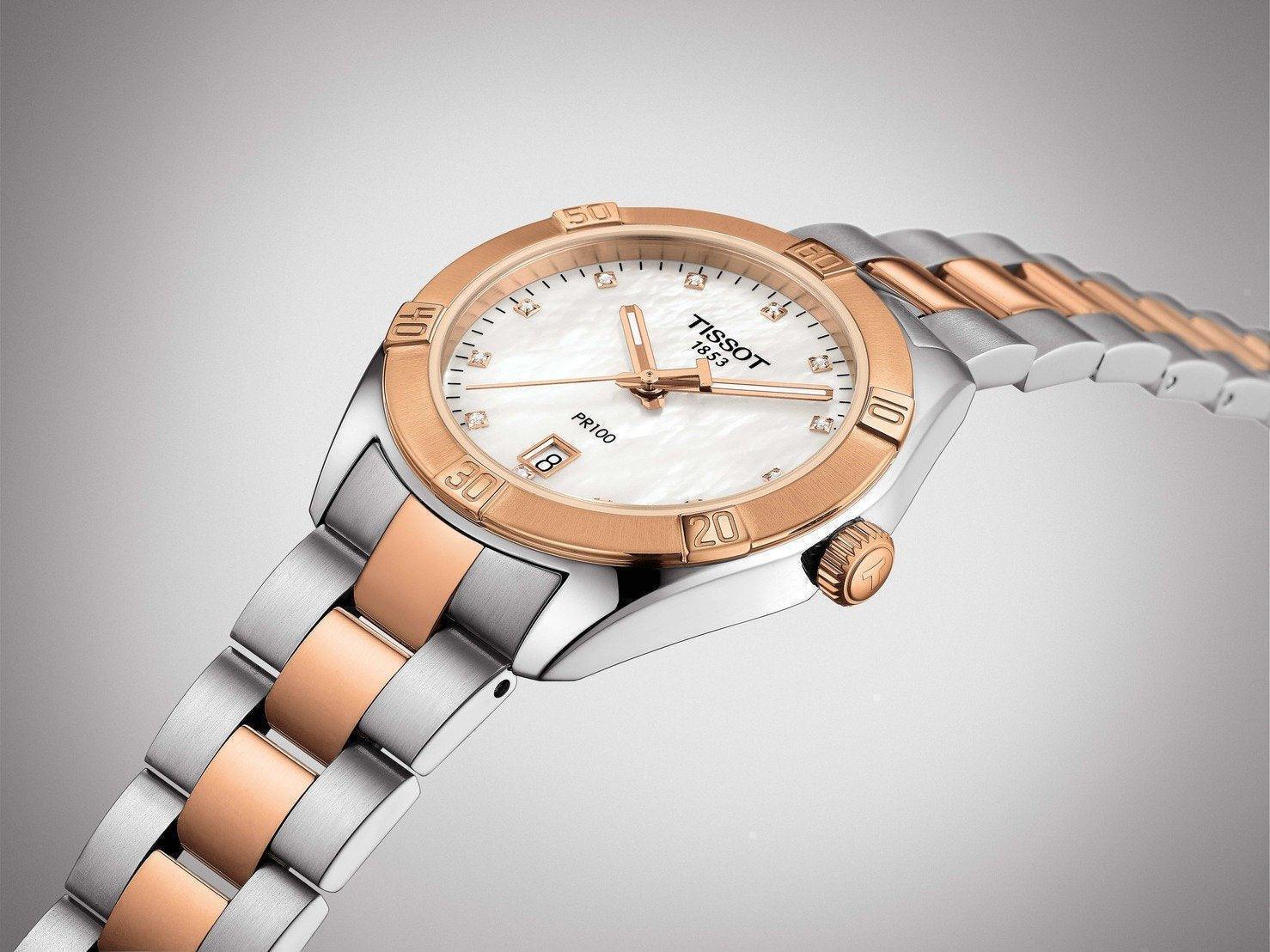 The Tissot PR 100 is a classic watch destined to be worn often and for every occasion. It features the simple and elegant face the collection is loved for, with the pared-back aesthetic symbolizing luxury, quality and classic style. Two tone stainless steel with rose gold PVD coating case and bracelet. Case size 36mm. Water resistance upto 100 meters. Scratch resistant sapphire crystal. White mother-of-pearl dial with 12 diamonds on the index markers. Swiss quartz movement.