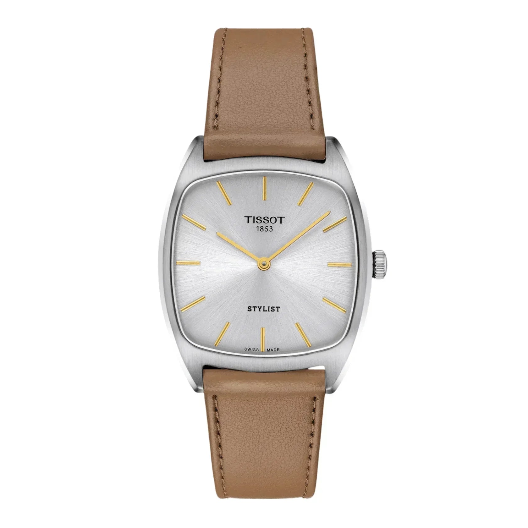 Known for its dainty silhouette, the Stylist has long been a standout in the world of watches. Drawing inspiration from its roots, the newly updated model brings a youthful energy that is sure to turn heads. The colour palettes are subtle yet playful, with shades of silver paired with complementary tones that enhance its body. This model showcases a silver-tone dial with a radiant sunburst finish, gold-toned hour markers, and matching gold-toned hands that beautifully complement its beige strap, offering a clean, modern shape. Water-resistant up to 50 meters, the Stylist offers durability, making it the perfect choice for everyday wear and more formal occasions. At the core of the reimagined Tissot Stylist is a highly precise quartz movement, celebrated for its reliability and ease of maintenance. No need to worry about constant adjustments, this watch is made to keep up with your busy lifestyle.